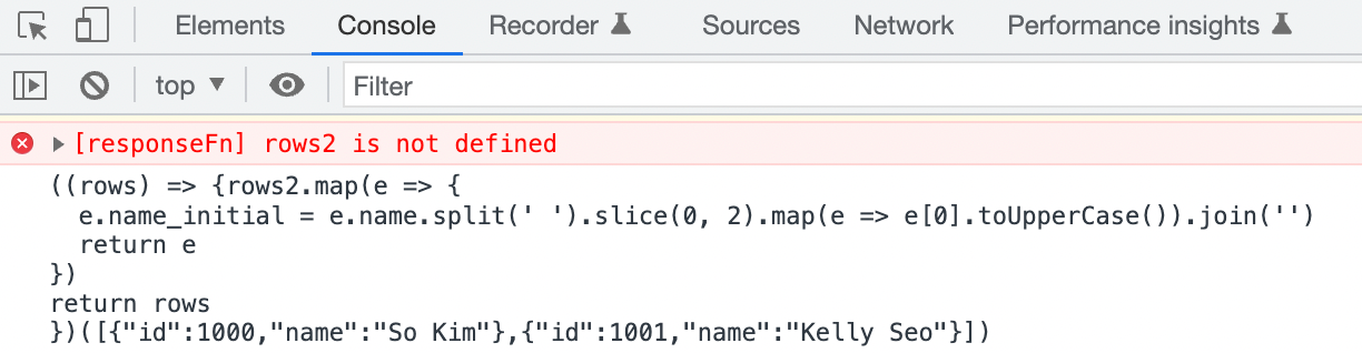 응답결과물 전체를 rows 변수로 넘겨 원하는 코드를 실행합니다.