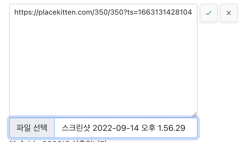 - 원하는 파일을 선택하면 즉시 API 호출되어 업로드 완료 후 URL 값이 채워집니다.